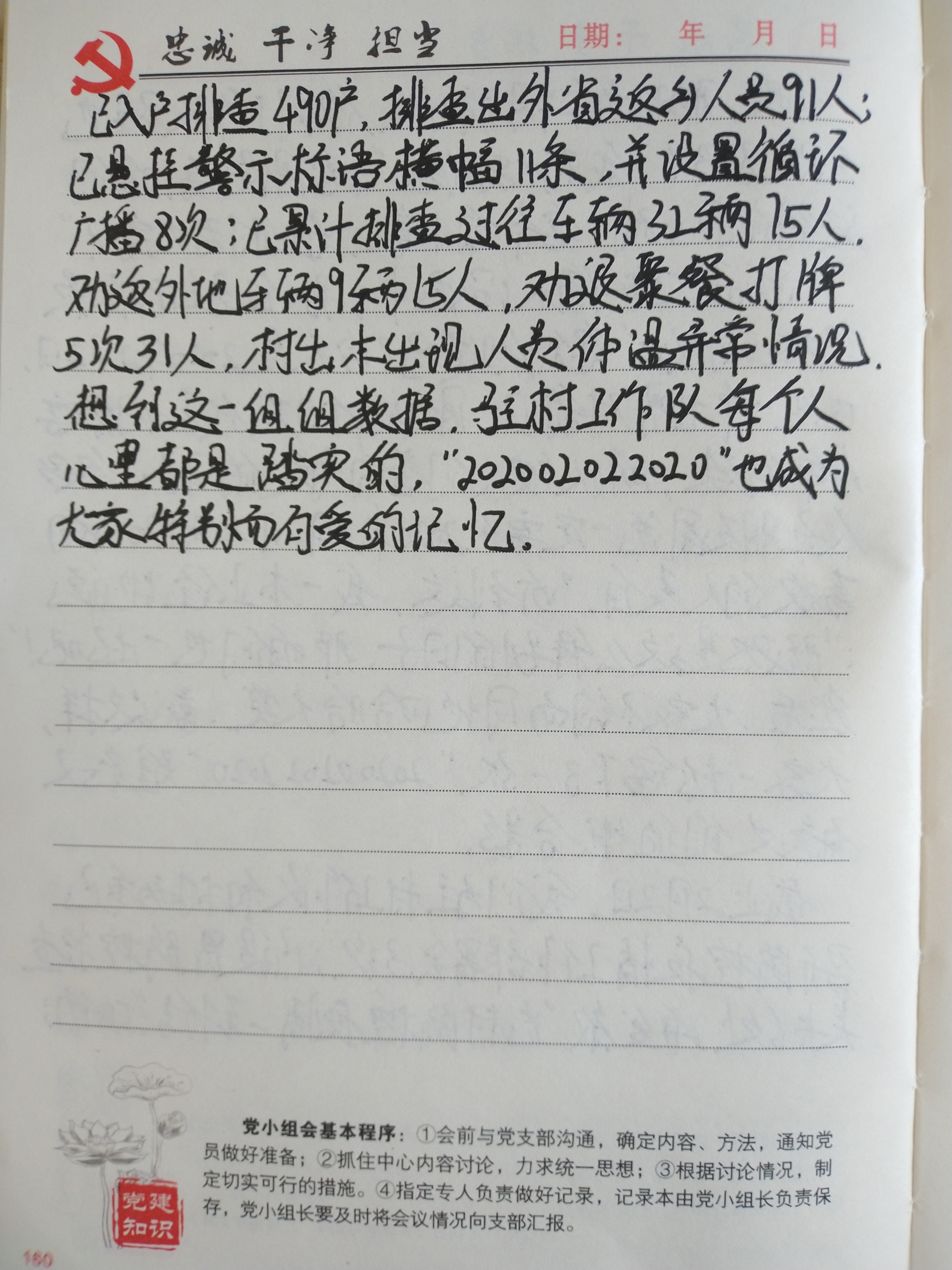 截至2月2日,我們駐村(cun)工作隊和村(cun)兩(liang)委已(yi)召開(kai)防控疫(yi)情(qing)工作部(bu)署會3次(ci)(ci);已(yi)設置防控檢查關卡6處,并發放(fang)“光(guang)村(cun)防控疫(yi)情(qing)一封信”500份;已(yi)入(ru)戶排(pai)(pai)查490戶,排(pai)(pai)查出外(wai)省返(fan)鄉人(ren)員91人(ren);已(yi)懸(xuan)掛警示標語橫幅11條,并設置循環(huan)播放(fang)廣(guang)播8處;已(yi)累計排(pai)(pai)查過(guo)往(wang)車輛(liang)32輛(liang)75人(ren),勸(quan)返(fan)外(wai)地車輛(liang)9輛(liang)15人(ren),勸(quan)退聚餐(can)打牌5次(ci)(ci)31人(ren),村(cun)內暫未出現人(ren)員體(ti)溫異(yi)常情(qing)況。想(xiang)到這一組組的防控疫(yi)情(qing)數據,駐村(cun)工作隊每個人(ren)心里(li)都是踏實(shi)的,“202002022020”也成(cheng)為(wei)大家特別而有愛的記憶(yi)。