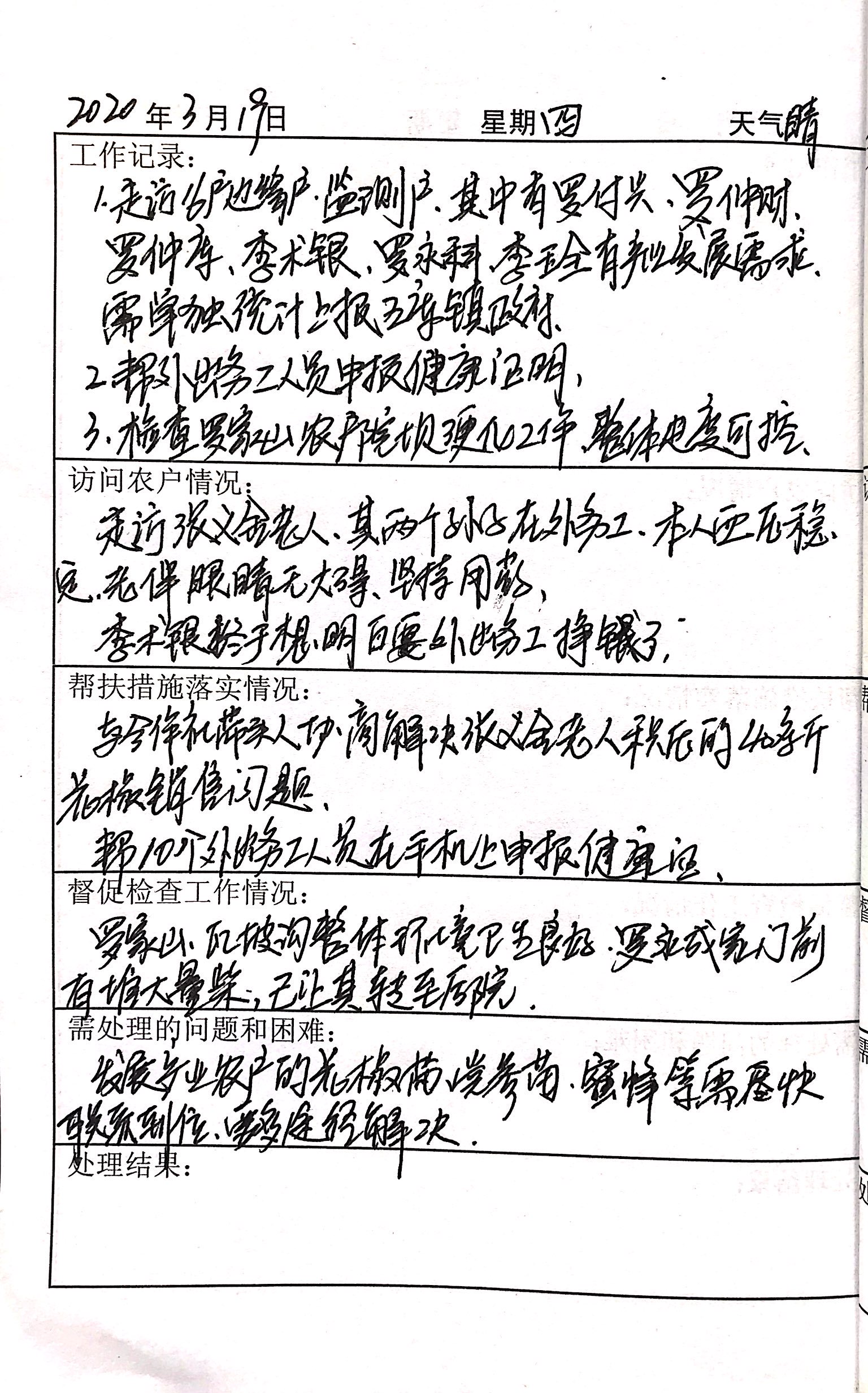 我(wo)從張義金(jin)家(jia)出(chu)來,繼續走(zou)了(le)羅家(jia)山社7戶人家(jia),瓦坡溝5戶人家(jia)。其中(zhong)3戶是(shi)單(dan)(dan)身(shen)中(zhong)年(nian)(nian)人,有一位叫李(li)術銀的單(dan)(dan)身(shen),今(jin)年(nian)(nian)45歲(sui)了(le),去年(nian)(nian)入戶時他(ta)(ta)反映自己(ji)沒吃的、沒錢用,后(hou)面了(le)解到他(ta)(ta)每天“閑游閑轉”,不(bu)勞(lao)動,不(bu)打工(gong)。春(chun)節前就(jiu)和(he)他(ta)(ta)談(tan)過,年(nian)(nian)后(hou)幫(bang)助他(ta)(ta)找(zhao)個工(gong)作,出(chu)門打工(gong)去,那(nei)時候他(ta)(ta)還不(bu)同意(yi)。今(jin)天,他(ta)(ta)主動告訴我(wo),要和(he)村里的人一起上新疆石(shi)河(he)子種棉花(hua)去,不(bu)能給政府添(tian)麻(ma)煩。臨走(zou),他(ta)(ta)開玩笑說年(nian)(nian)底掙錢了(le)邀(yao)請我(wo)喝酒(jiu)。