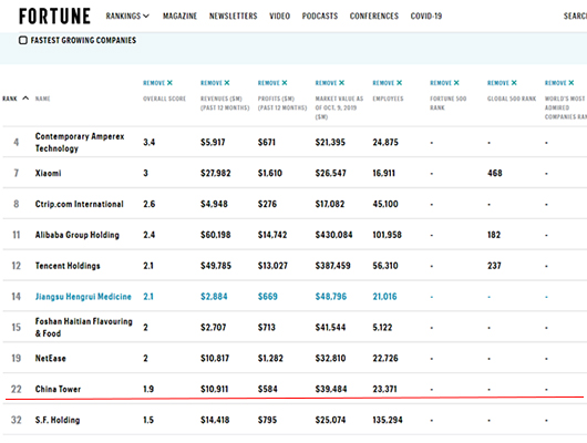 2019年10月,中國鐵塔分別入選《財富》雜志全球未來50強,排名第22位;入選福布斯全球數字經濟100強,排名第71位。