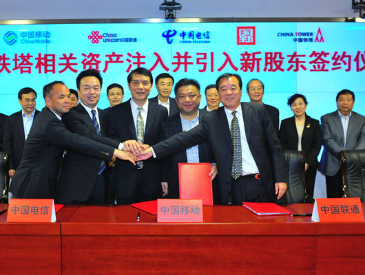 2015年10月14日,中國鐵塔與三家電信企業及中國國新控股有限公司簽署交易協議,向三家電信企業收購全部存量鐵塔相關資產,并同步引入新股東中國國新。10月底完成三家電信企業存量鐵塔相關資產的注入收購,實現全國通信鐵塔統一運營。