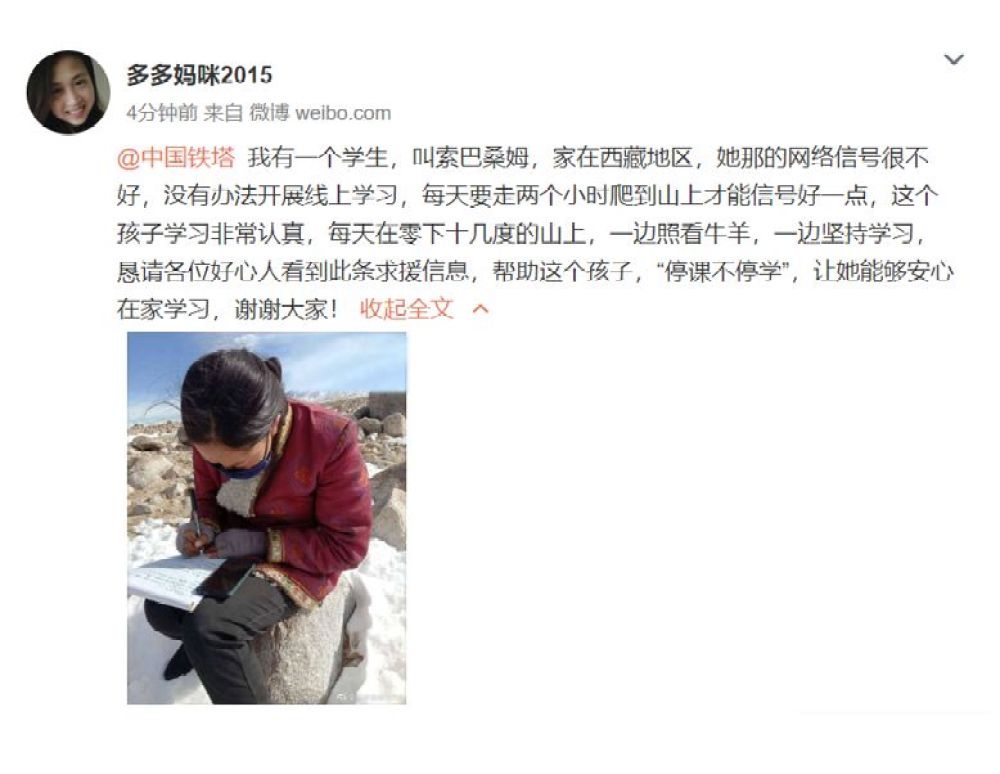 3月2號(hao),尹莉注冊(ce)了微(wei)博賬號(hao),發了一條微(wei)博:“我有(you)一個(ge)(ge)學生,叫索(suo)巴桑姆,家在西藏(zang)地(di)區,她那的網絡信號(hao)很不好,沒有(you)辦法開展線上學習,每天要(yao)走兩(liang)個(ge)(ge)小時(shi)爬到山上才(cai)能信號(hao)好一點……”