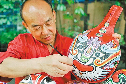 第十五屆文博會錦繡中華分會場非遺藝人在制作臉譜面具。