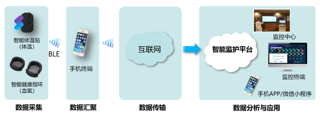 面向抗擊疫情一線的(de)(de)醫護(hu)(hu)人員(yuan),可通(tong)(tong)過佩戴智(zhi)(zhi)能體(ti)溫貼和智(zhi)(zhi)能健(jian)康指環(huan)進行體(ti)溫、血(xue)氧的(de)(de)遠程連續監(jian)測。考慮(lv)到他們(men)連續工作(zuo)的(de)(de)特(te)殊性,集(ji)成(cheng)了輕巧(qiao)舒適(shi)、不(bu)易脫落,且具備防水性能的(de)(de)智(zhi)(zhi)能健(jian)康指環(huan)用于監(jian)測血(xue)氧。醫護(hu)(hu)人員(yuan)存在(zai)極高的(de)(de)感染風險,僅提供口(kou)罩(zhao)等(deng)防護(hu)(hu)用品遠遠不(bu)夠,因此提供動態、連續的(de)(de)體(ti)溫、血(xue)氧監(jian)測手(shou)(shou)段,可通(tong)(tong)過手(shou)(shou)機App或微信小程序實現體(ti)征數據實時上傳及異常告警提示,進一步(bu)采取隔離(li)及救(jiu)治措施。