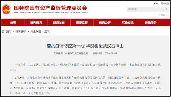 國務院國資委網站:奮戰“疫線”,華能馳援雷神山醫院建設