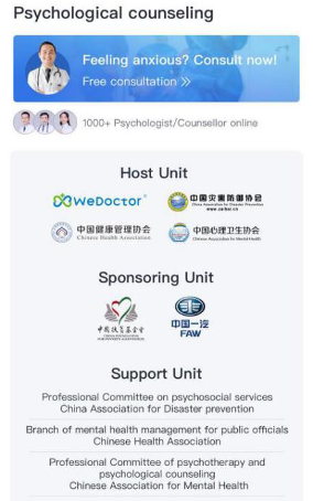此外(wai),中(zhong)國(guo)一汽還(huan)始(shi)終關注醫護(hu)人員的心(xin)理健康,聯合(he)中(zhong)國(guo)扶(fu)貧基(ji)金會、中(zhong)國(guo)災(zai)害防御協(xie)會、微醫集團、中(zhong)國(guo)健康管理協(xie)會和中(zhong)國(guo)心(xin)理衛生協(xie)會啟(qi)動“微心(xin)戰疫(yi)”公益項目,持(chi)續為醫護(hu)人員及普通民眾提(ti)供(gong)心(xin)理健康關懷!截至(zhi)3月29日(ri),“微心(xin)戰疫(yi)”已招(zhao)募(mu)心(xin)理咨詢師志愿者五千多(duo)人,提(ti)供(gong)各類心(xin)理服務71302人次。隨著當(dang)前疫(yi)情呈現全球化的趨(qu)勢,微心(xin)戰疫(yi)開啟(qi)了(le)海外(wai)版,為全球華(hua)人提(ti)供(gong)免費的心(xin)理咨詢服務。