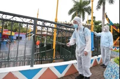 華僑城集團旗下深圳歡樂谷景區,工作人員在進行游樂設備的消殺防疫