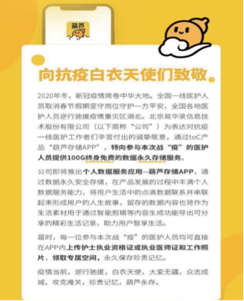 在(zai)做好公司疫(yi)情防控及復工(gong)(gong)復產(chan)(chan)同(tong)(tong)時,易華錄堅決履行社會責任,全力以赴。葫蘆存儲APP,面向個人(ren)實現(xian)數據永久(jiu)安全存儲,為(wei)表達對抗疫(yi)一線醫(yi)護(hu)(hu)工(gong)(gong)作(zuo)者們辛苦付出的誠摯敬(jing)意(yi),公司特向參與(yu)本(ben)次戰(zhan)“疫(yi)”的醫(yi)護(hu)(hu)人(ren)員提(ti)供100G終(zhong)身免費(fei)的數據永久(jiu)存儲服務(wu)。此次之外,結合各地政府的需(xu)求,易華錄向社會提(ti)供自研多款軟件產(chan)(chan)品(pin),包括“城市大腦(nao)-疫(yi)情防控專題”“應急(ji)指(zhi)揮調(diao)度移動版”“湖(hu)盤(pan) web 端(duan)系(xi)(xi)統”“綜合運(yun)輸疫(yi)情聯(lian)防聯(lian)控云(yun)(yun)服務(wu)”,系(xi)(xi)列提(ti)供云(yun)(yun)端(duan)服務(wu),并限時向企業客戶(hu)免費(fei)推出“科技(ji)戰(zhan)‘疫(yi)’,同(tong)(tong)舟共(gong)濟”系(xi)(xi)列云(yun)(yun)、網、安全解(jie)決方案(an),充分利用技(ji)術專長,為(wei)疫(yi)情防控保(bao)駕護(hu)(hu)航。