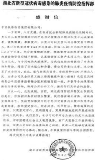 湖北省新型冠狀病毒感染肺炎疫情防控指揮部感謝信