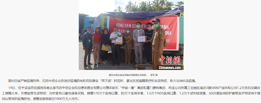 為(wei)助力(li)印度尼西(xi)亞政(zheng)府(fu)(fu)抗擊(ji)新(xin)冠疫情,公(gong)司多方(fang)籌措為(wei)印度尼西(xi)亞當(dang)地政(zheng)府(fu)(fu)和醫(yi)療(liao)部(bu)(bu)門捐(juan)贈(zeng)了(le)170萬個(ge)醫(yi)用一次(ci)性醫(yi)用口罩(zhao)、80萬個(ge)醫(yi)用手套、1.5萬個(ge)N95醫(yi)用口罩(zhao)、1.2萬個(ge)試(shi)(shi)劑測試(shi)(shi)盒、6000套防(fang)護服(fu)等(deng)醫(yi)療(liao)物(wu)資(zi),同時為(wei)園區內印度尼西(xi)亞員工及(ji)當(dang)地村民(min)發(fa)放了(le)大米、方(fang)便面等(deng)生活物(wu)資(zi),受到了(le)當(dang)地政(zheng)府(fu)(fu)和周(zhou)邊村民(min)的極大贊(zan)譽,營造了(le)良好的企業(ye)發(fa)展外部(bu)(bu)環(huan)境。