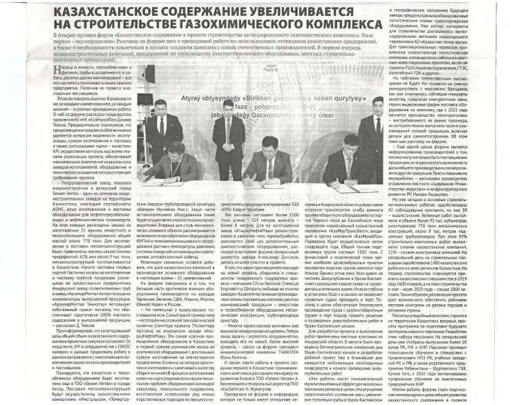 2019年10月18日哈薩克斯坦商報對IPCI項目建設過程中與本土企業的合作進行報道