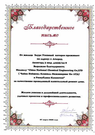 2020年2月(yue)(yue)份分公司(si)在獲悉(xi)阿特(te)(te)勞市區某貧困家(jia)庭(ting)生活舉步維艱的情(qing)況后,在阿特(te)(te)勞市政府的幫助下,與該家(jia)庭(ting)取得聯系。經分公司(si)黨支部調研(yan)了(le)解(jie),該家(jia)庭(ting)兩(liang)(liang)名成員,母(mu)親(qin)高(gao)齡退休(xiu),兒子殘疾無正常工(gong)作,母(mu)子兩(liang)(liang)人(ren)僅靠微(wei)薄的社會保(bao)障金(jin)相依為(wei)命。住(zhu)房(fang)多(duo)年失修(xiu),墻壁(bi)布滿裂痕,幾近危(wei)房(fang);供(gong)暖(nuan)系統多(duo)年未(wei)維護,雖(sui)在室(shi)內,還是(shi)能(neng)深切的感(gan)受到冬天的嚴寒。分公司(si)黨支部同志(zhi)了(le)解(jie)情(qing)況后一致認(ren)為(wei),應該對這樣的家(jia)庭(ting)進行幫扶(fu),對其房(fang)屋進行大修(xiu)改造(zao)。隨(sui)派兩(liang)(liang)名專業(ye)工(gong)程(cheng)師對房(fang)屋狀況進行了(le)勘(kan)察(cha),協調專業(ye)隊伍進行維修(xiu)。在歷經3周馬不停蹄的趕工(gong)后,于2020年3月(yue)(yue)7日將新(xin)房(fang)移交給(gei)了(le)房(fang)主(zhu)。在搬進新(xin)房(fang)的那一刻,房(fang)主(zhu)老(lao)奶奶激動不已、一再哽咽,感(gan)謝(xie)中國人(ren),感(gan)謝(xie)中國化學工(gong)程(cheng),還特(te)(te)別(bie)準備(bei)了(le)感(gan)謝(xie)信。