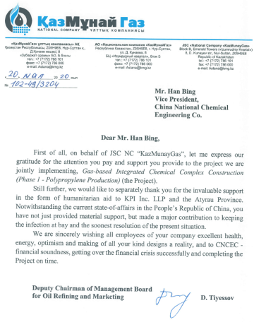 2020年的(de)新冠疫情,對人(ren)類是一(yi)(yi)(yi)個大(da)考(kao),在這場大(da)考(kao)中,無疑(yi)要依(yi)靠強有(you)(you)力(li)(li)的(de)組(zu)織,團結和(he)(he)凝(ning)聚一(yi)(yi)(yi)切(qie)力(li)(li)量方可勝出。我(wo)們深信在堅(jian)決(jue)(jue)貫徹落實總書記要求(qiu),堅(jian)決(jue)(jue)執行公司關于防疫工(gong)作(zuo)的(de)各項(xiang)規(gui)(gui)定的(de)情況下,終將(jiang)(jiang)戰勝疫情!在疫情長期化斗爭中,我(wo)們將(jiang)(jiang)持(chi)續秉承“互(hu)惠互(hu)利(li)、和(he)(he)諧發展(zhan)(zhan)(zhan)”的(de)理(li)念(nian),在項(xiang)目建(jian)設和(he)(he)企業運營中,嚴格遵守當地(di)法(fa)律法(fa)規(gui)(gui),踐行綠(lv)色發展(zhan)(zhan)(zhan)和(he)(he)屬地(di)化管理(li)原則,助力(li)(li)哈薩克斯坦社會(hui)經濟發展(zhan)(zhan)(zhan)和(he)(he)民生改善,努力(li)(li)打(da)造民心相(xiang)通的(de)“一(yi)(yi)(yi)帶一(yi)(yi)(yi)路(lu)”。為當地(di)員工(gong)、百(bai)姓解決(jue)(jue)實際困難,進一(yi)(yi)(yi)步開展(zhan)(zhan)(zhan)有(you)(you)意義的(de)活(huo)動,提高履(lv)行社會(hui)責任的(de)能力(li)(li)。我(wo)們將(jiang)(jiang)繼(ji)續砥礪前行、甘于奉獻,用(yong)實際行動踐行化工(gong)人(ren)的(de)初心和(he)(he)使命;將(jiang)(jiang)繼(ji)續齊心協力(li)(li)、身(shen)體力(li)(li)行,為將(jiang)(jiang)項(xiang)目打(da)造為“一(yi)(yi)(yi)帶一(yi)(yi)(yi)路(lu)”沿(yan)線國家示范項(xiang)目貢獻力(li)(li)量。