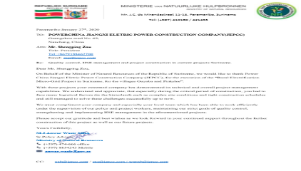 蘇里南共和國自然資源部致信感謝江西電建公司,并函邀江西電建公司參與設計該國電力規劃