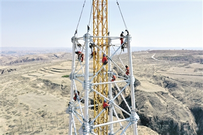 國網工人在蒙西—晉中特高壓交流工程線路工程(內蒙古段)12號鐵塔施工現場作業(無人機照片)。該工程是華北“兩橫三縱”特高壓交流主網架的重要組成部分。