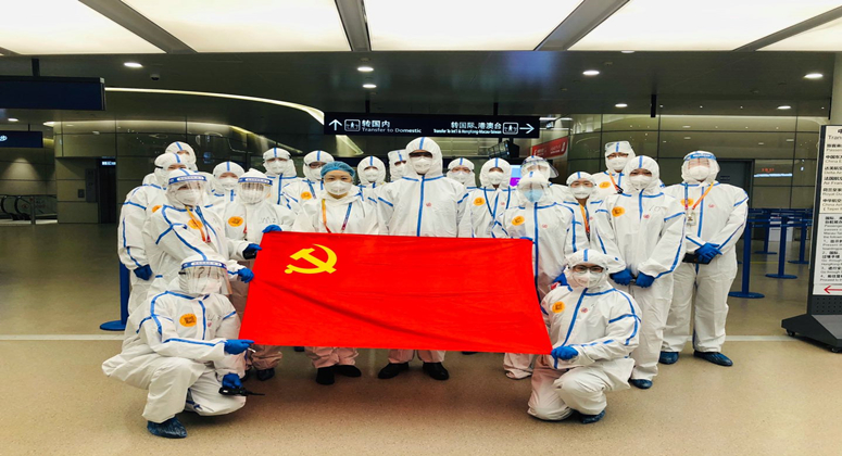 新冠肺炎疫情期間(jian),東(dong)(dong)航集(ji)團在(zai)(zai)上海虹橋、浦東(dong)(dong)機場(chang)組建黨(dang)(dang)員突擊隊,嚴防境(jing)內(nei)疫情擴散,嚴防境(jing)外疫情輸入。圖為浦東(dong)(dong)機場(chang)東(dong)(dong)航地服黨(dang)(dang)員員工在(zai)(zai)工作后合影留念。