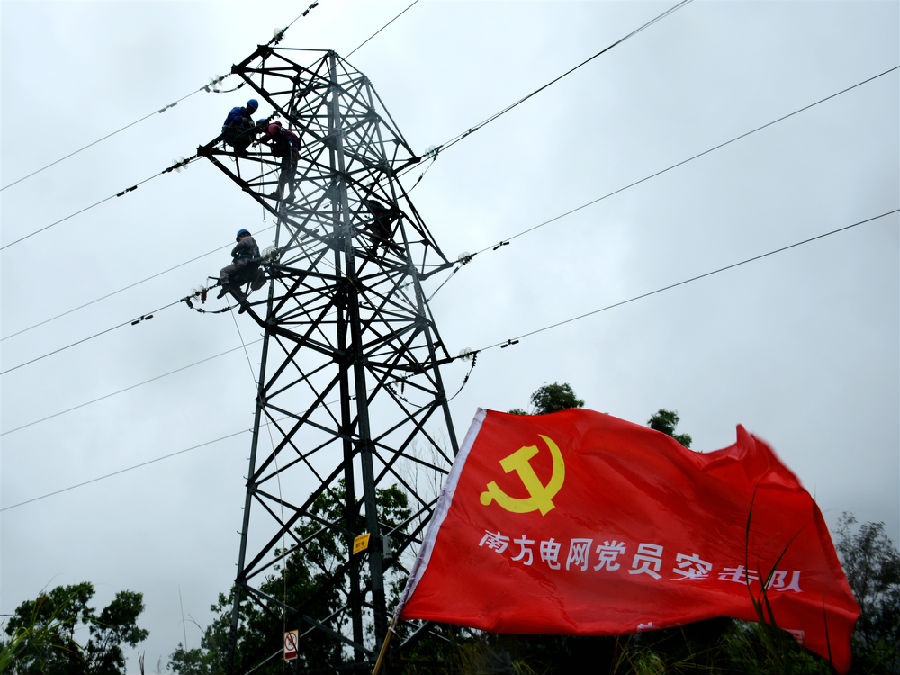 6月14日,臺風“鸚鵡”來襲,南方電網廣東(dong)茂名(ming)信(xin)宜供(gong)電局(ju)黨(dang)員突擊隊(dui)現場搶修。(葉茂 攝(she))