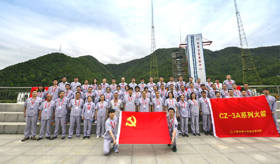 圖為長三乙火箭試驗隊在發射塔架前合影。