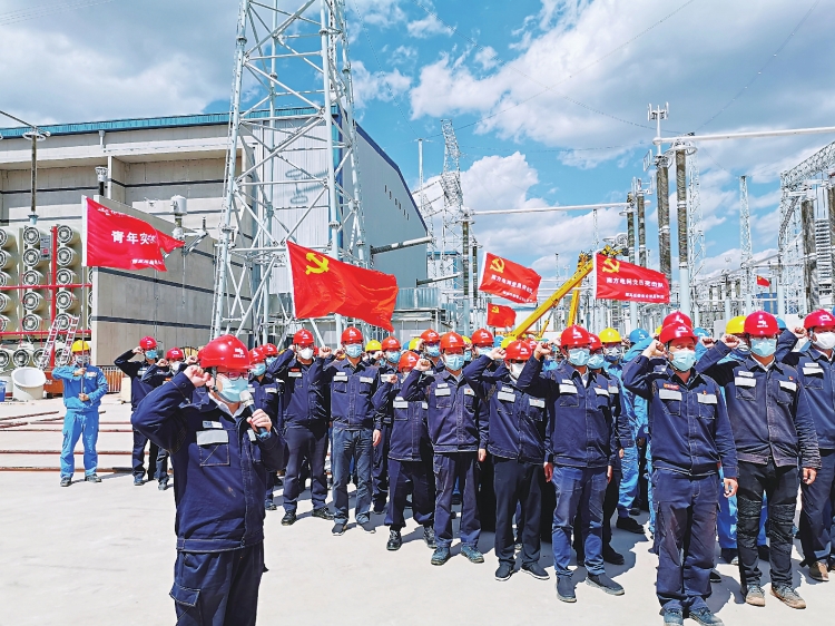 今年4月18日,昆北換流站工程攻堅現場,昆柳龍直流昆北黨支部黨員們重溫入黨誓詞。