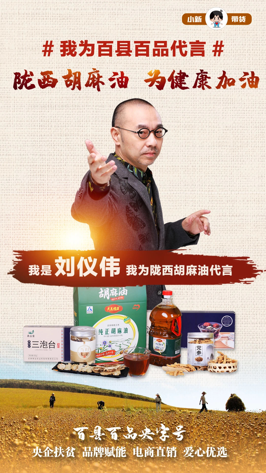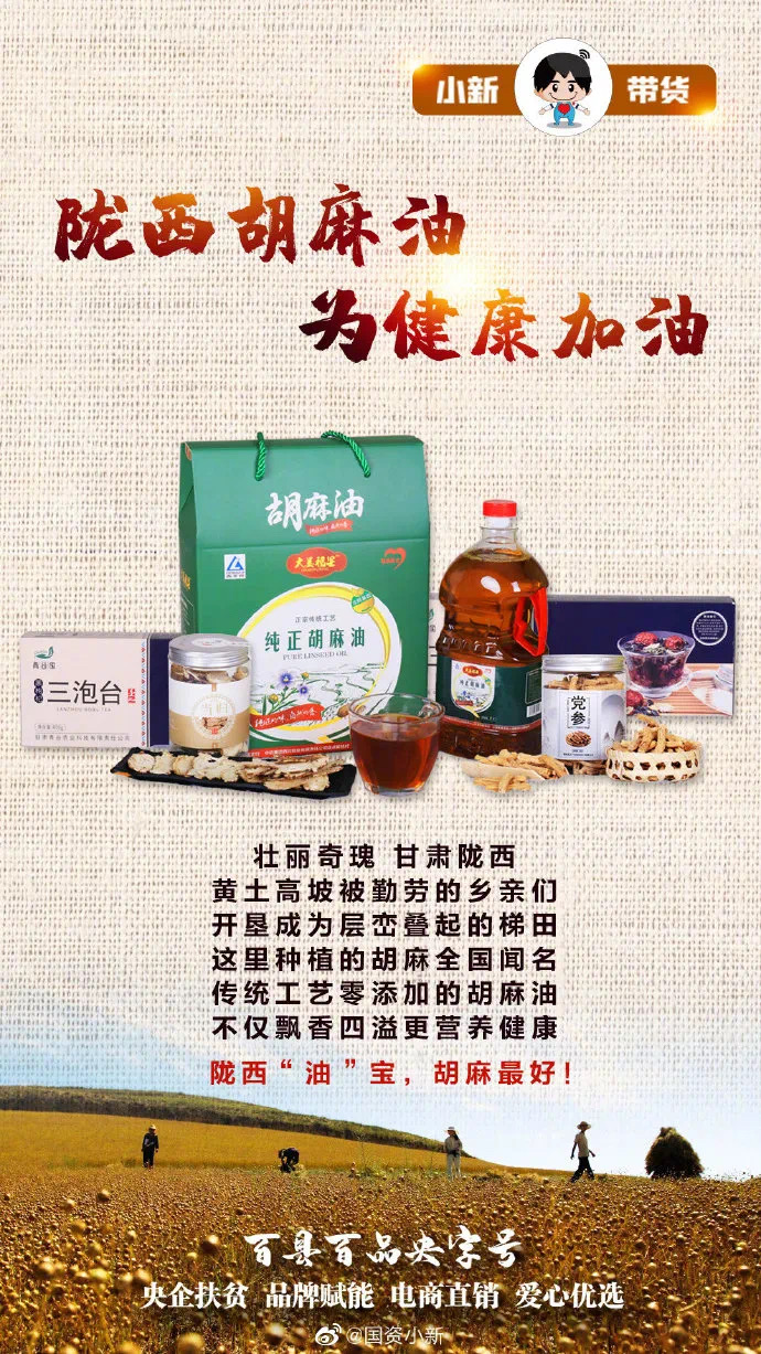 6月(yue)19日17:00-19:00,百縣(xian)百品(pin)央(yang)字號暨小(xiao)新(xin)帶(dai)貨第六(liu)場(chang),走(zou)(zou)進國藥(yao)集團(tuan)中國生物定點幫扶(fu)縣(xian)——甘肅省隴西縣(xian),直播帶(dai)貨“道地養生農產品(pin)”隴西胡麻油及(ji)當地特(te)色農產品(pin)。助(zhu)力(li)當地特(te)色農產品(pin),走(zou)(zou)出大山、走(zou)(zou)向(xiang)全國。