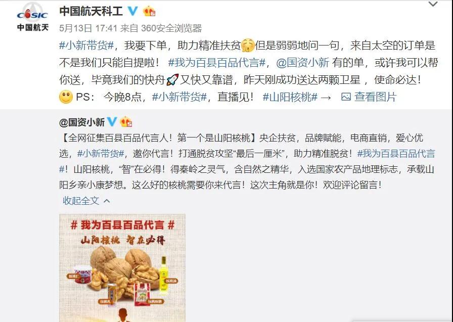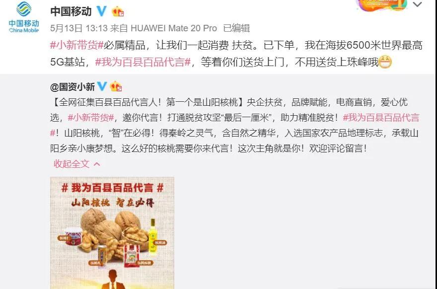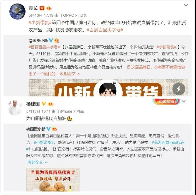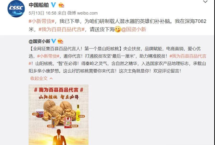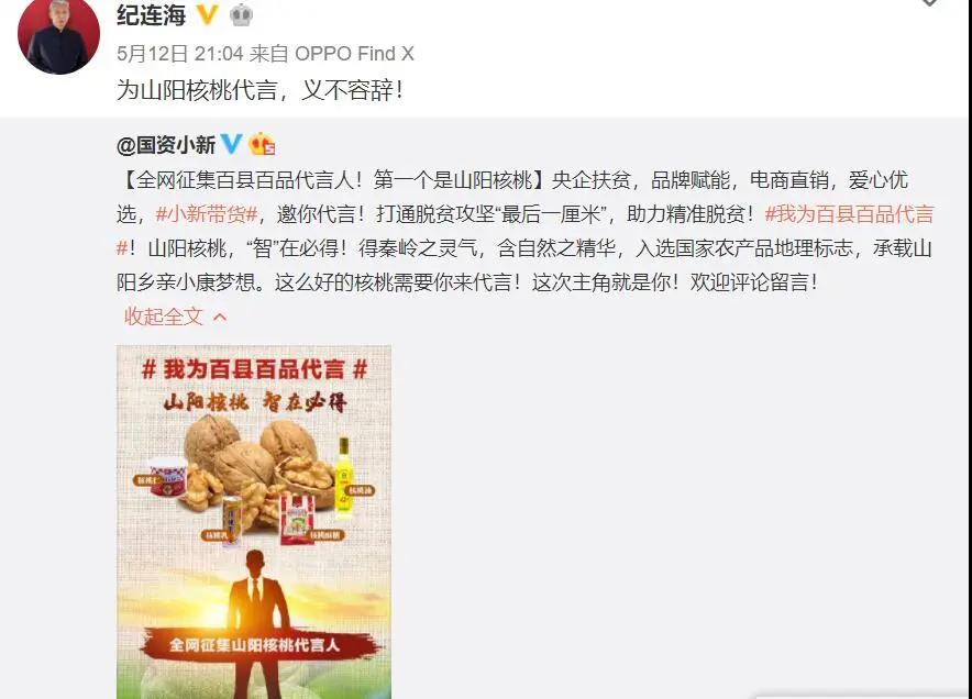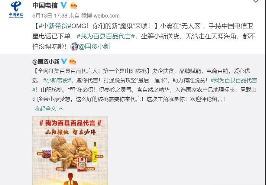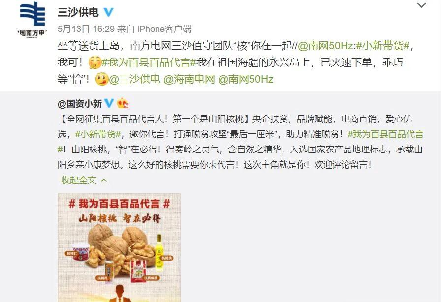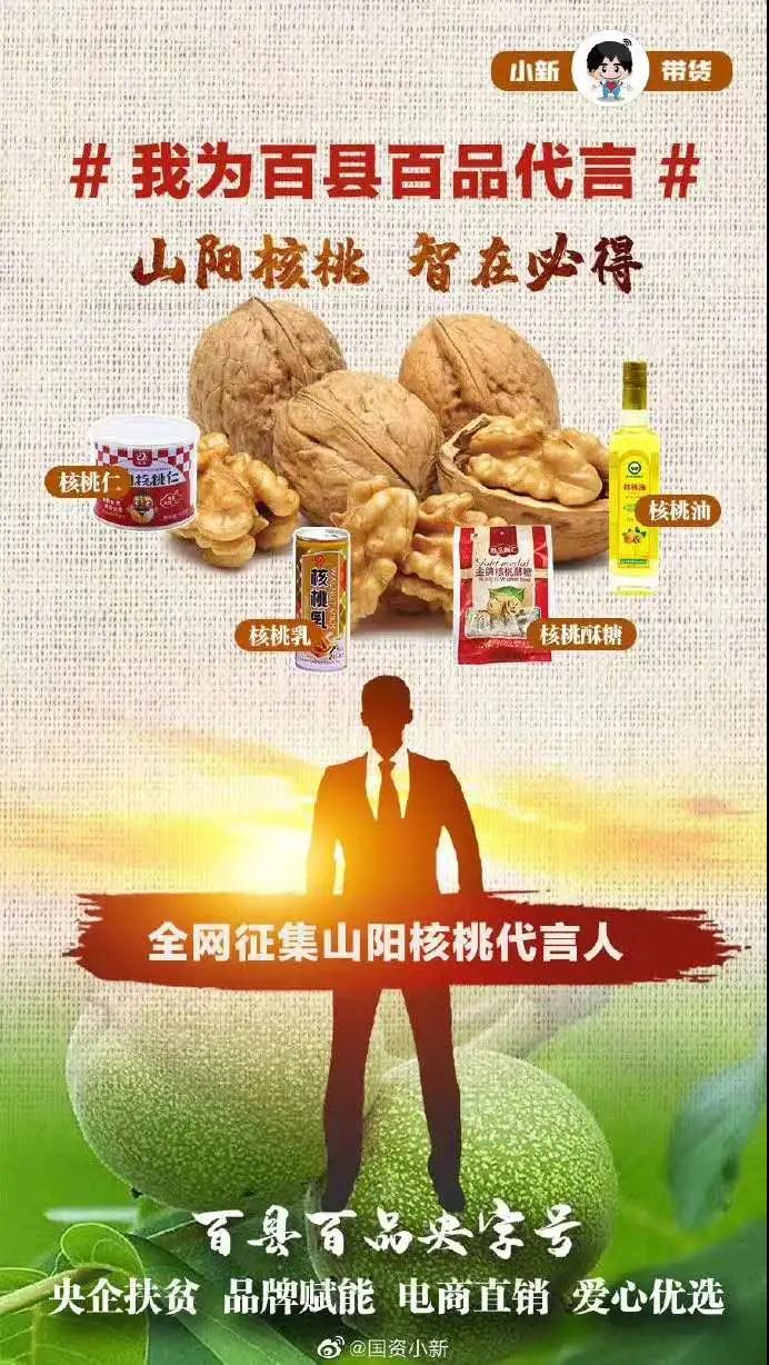 5月13日,“國資小新”又在微博發起“我為百縣百品代言”網(wang)絡互動(dong),全(quan)網(wang)征集山陽核桃代言人。