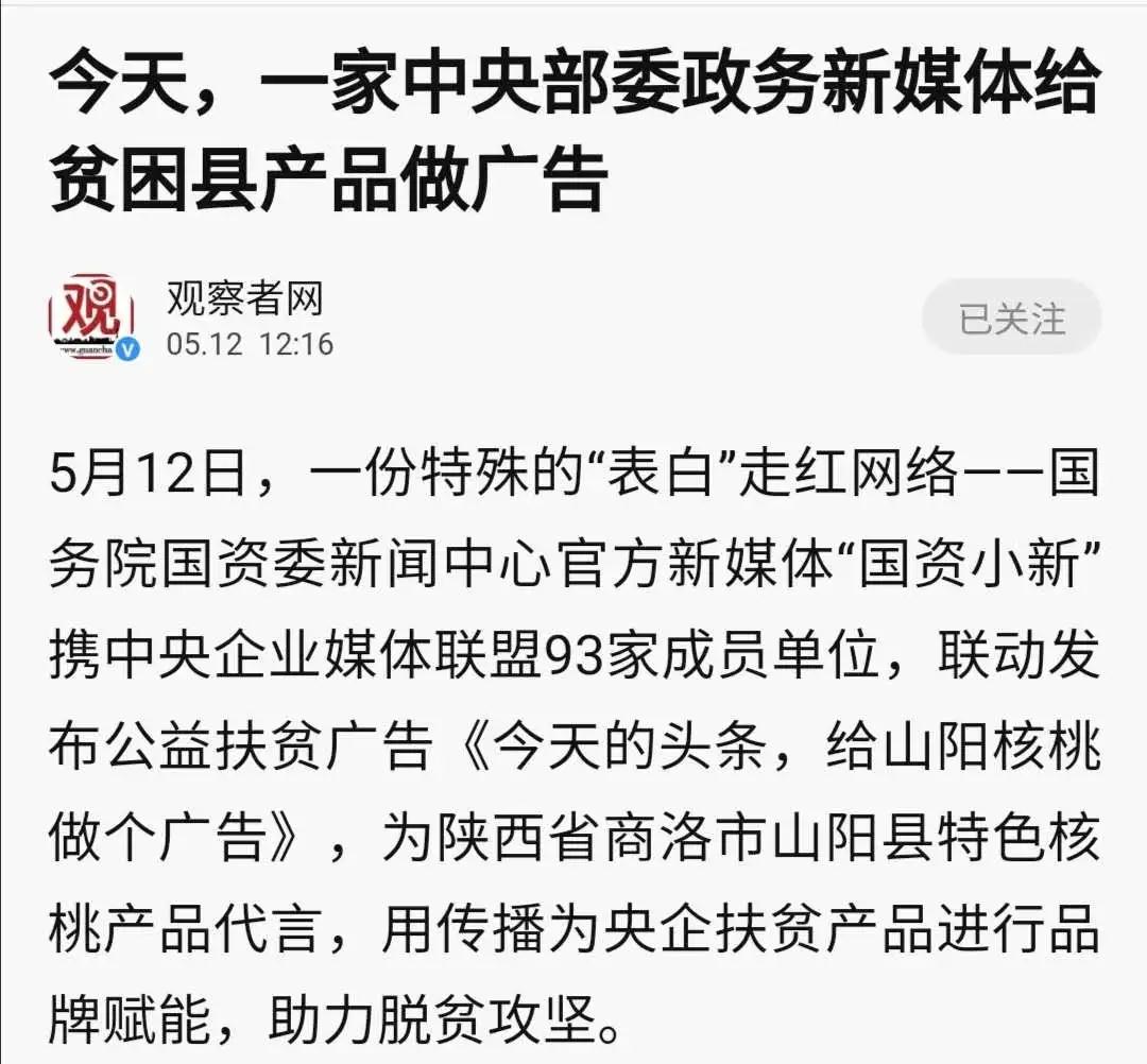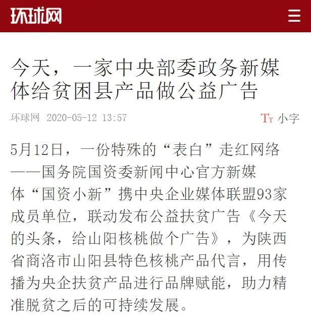 5月12日,“國資(zi)小新”制作發(fa)布了公益廣告《山陽(yang)(yang)核桃 智在必(bi)得》,并把當天(tian)的頭條(tiao)留給山陽(yang)(yang)核桃免費(fei)推廣。