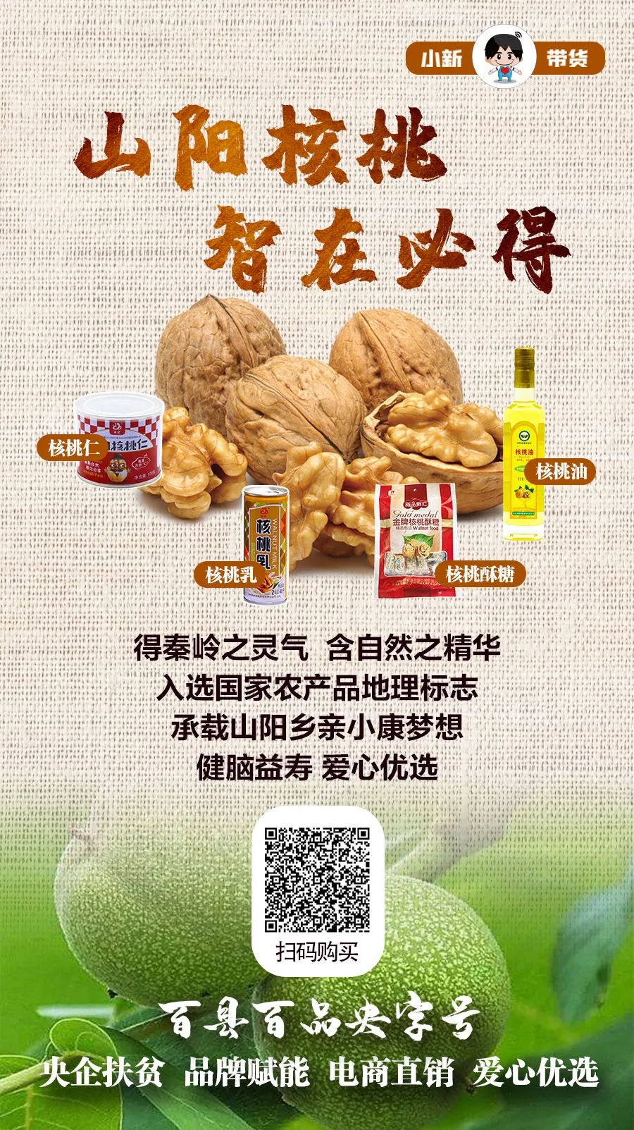 “毛主席1958年(nian)就做出(chu)指示,陜西商洛專區每戶種一升(sheng)核桃。”中(zhong)國鋼研掛職(zhi)扶貧副縣(xian)長(chang)金雪華娓(wei)娓(wei)道來,在直(zhi)播中(zhong)講述山(shan)(shan)陽核桃家族的故事。山(shan)(shan)陽縣(xian)是央企中(zhong)國鋼研的定點(dian)扶貧縣(xian),被(bei)譽為“中(zhong)國核桃之鄉”。