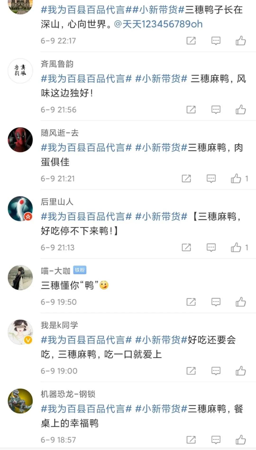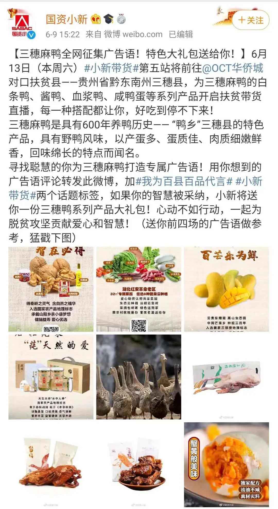 直播(bo)開始前(qian),為讓更多人(ren)參與助(zhu)農行動,6月9日起,小(xiao)新(xin)便在微博發起了三穗麻鴨(ya)(ya)廣(guang)告語全網征集,擴大傳播(bo)為三穗麻鴨(ya)(ya)品牌賦(fu)能(neng)。