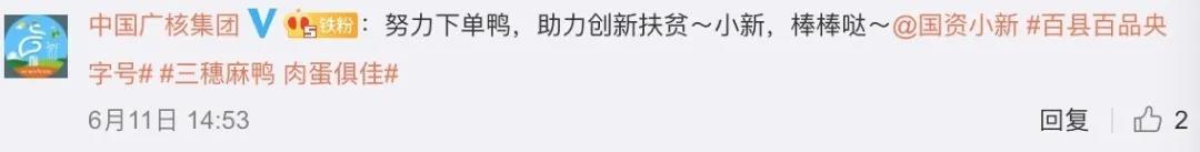 中(zhong)(zhong)(zhong)(zhong)核(he)集團(tuan)(tuan)、兵器工(gong)業集團(tuan)(tuan)、中(zhong)(zhong)(zhong)(zhong)國(guo)(guo)石油、中(zhong)(zhong)(zhong)(zhong)國(guo)(guo)石化、國(guo)(guo)家能源(yuan)集團(tuan)(tuan)、中(zhong)(zhong)(zhong)(zhong)國(guo)(guo)電信、中(zhong)(zhong)(zhong)(zhong)國(guo)(guo)煤炭地質總局、中(zhong)(zhong)(zhong)(zhong)廣核(he)、中(zhong)(zhong)(zhong)(zhong)國(guo)(guo)生(sheng)物(wu)等眾多企業轉發(fa)互動,為(wei)三穗(sui)麻鴨帶(dai)貨(huo)助力。