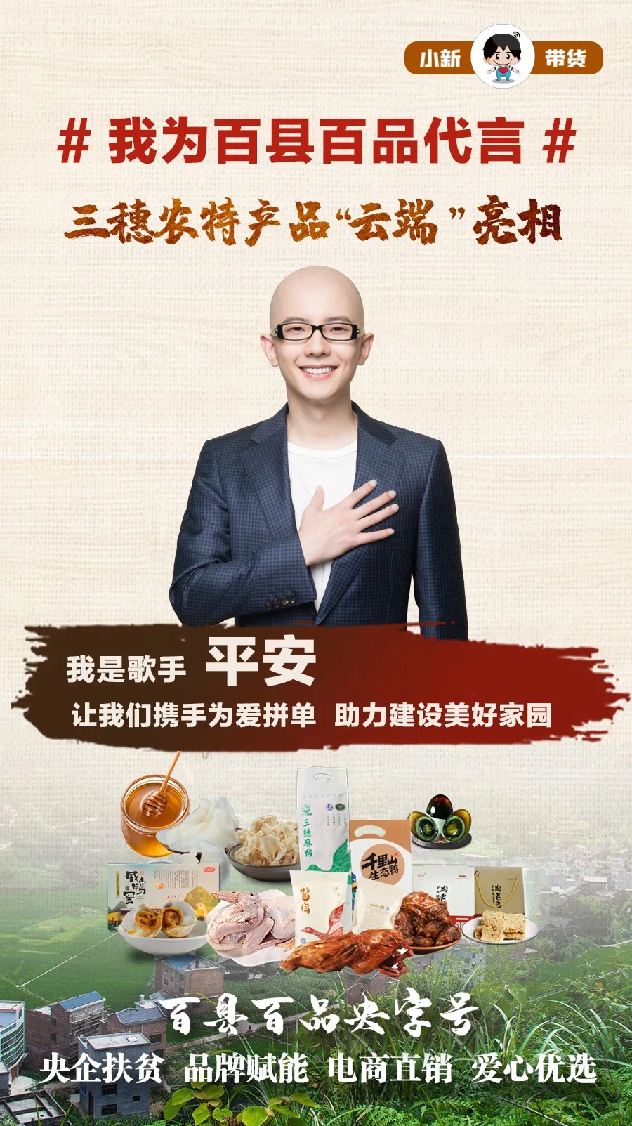 直播(bo)現場,還連(lian)線了首屆CCTV《直通春晚》全國(guo)總冠軍@歌手平安,一起為(wei)消費(fei)扶貧打call。平安贊美貴州(zhou)好山好水產(chan)好鴨(ya),呼吁大家愛心助農,下單不要(yao)猶豫(yu)“鴨(ya)”。