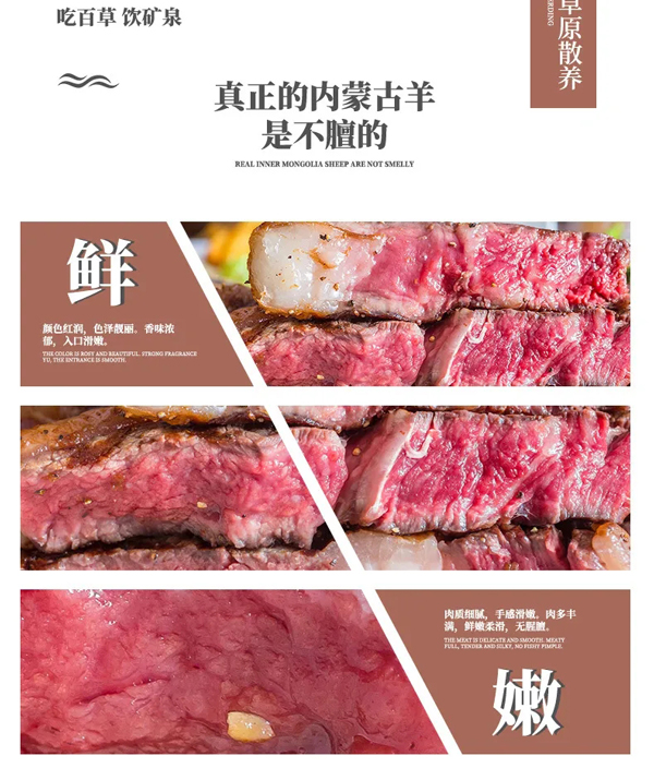 武川草(cao)地羊(yang)(yang)選自內蒙古(gu)高海拔草(cao)場散養的“蘇尼特羊(yang)(yang)”和(he)“烏珠穆沁(qin)羊(yang)(yang)”及小尾(wei)寒羊(yang)(yang)等,屬于完全草(cao)飼的羊(yang)(yang),胴(dong)體(ti)豐滿,色澤鮮美,肉(rou)層厚實(shi)緊湊,高蛋白,低脂(zhi)肪,瘦肉(rou)率(lv)高,富有人體(ti)所需各種氨基(ji)酸(suan)和(he)脂(zhi)肪酸(suan)。肉(rou)質細(xi)嫩(nen)鮮美、肥(fei)瘦相間(jian)、肥(fei)而不膩、絕(jue)無(wu)一點膻味。