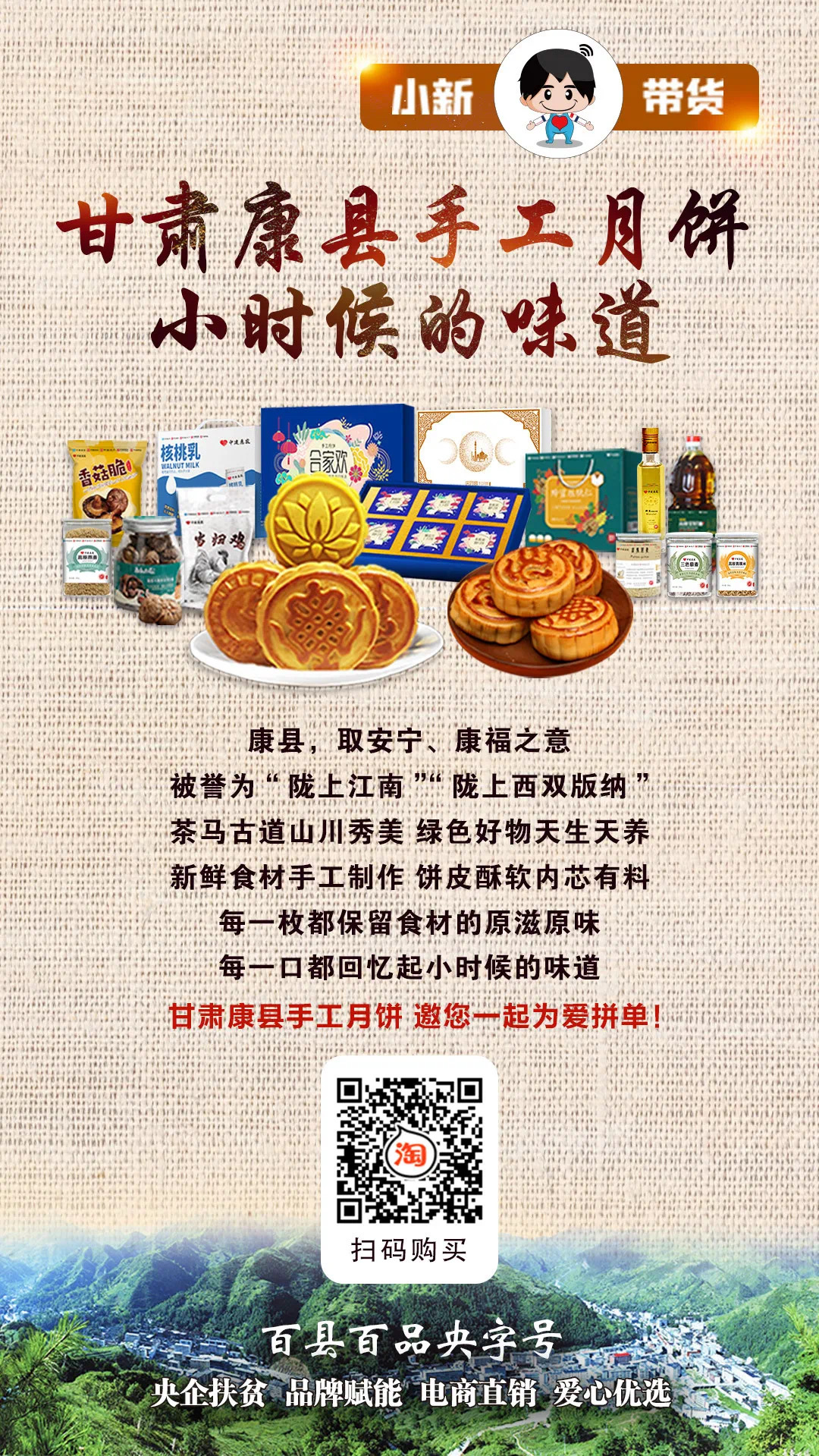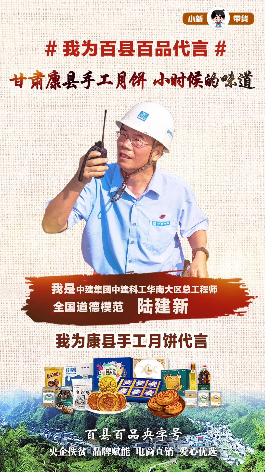 8月(yue)27日“百縣(xian)百品央字號”暨“小新帶貨”第二十(shi)二場(chang),“甘肅康(kang)縣(xian)手工月(yue)餅專(zhuan)場(chang)”走進中建集團定點扶貧縣(xian)——甘肅省隴南市康(kang)縣(xian)。
