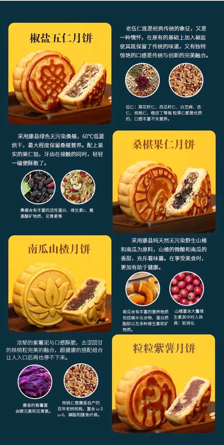 椒(jiao)鹽五(wu)仁(ren)、粒(li)粒(li)紫薯(shu)、桑椹(shen)果仁(ren)、南瓜山楂……多款口味豐富的獨特(te)月餅(bing),所有原(yuan)材料均產(chan)自當(dang)地(di)。
