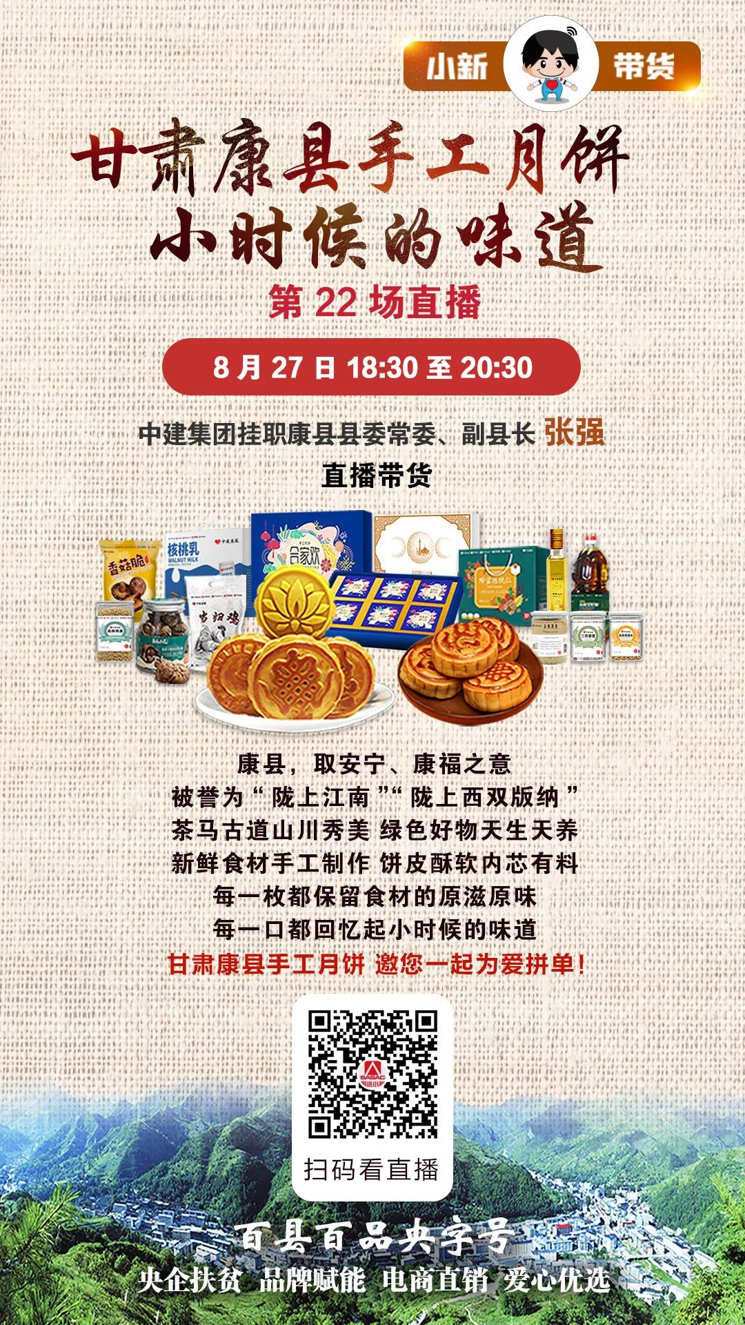 8月27日(ri)18:30至(zhi)20:30,“百縣百品(pin)央(yang)字(zi)號”暨(ji)“小新帶貨”走進“隴上(shang)江(jiang)南”康縣,在直播(bo)間里(li),手工月餅等(deng)十余款特產(chan)好物等(deng)你采購。
