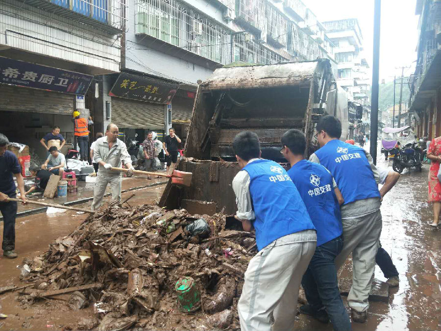 四川省合江縣福寶鎮遭遇特大暴雨,主干道被20厘米厚的淤泥雜物覆蓋,中交一航局合江項目組織18人的突擊隊進行處理。