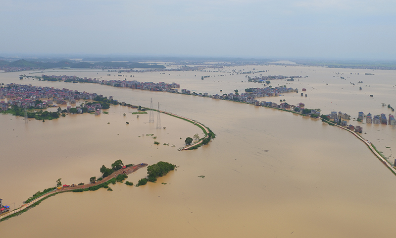 問桂道決口合龍后,中國安能救援主力部分轉移至中洲圩決口處,圖為動力舟橋運輸大型主戰裝備。