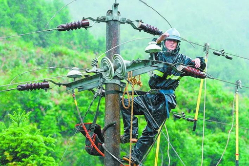 國網江西婺源縣供電公司員工冒雨搶修受損線路。