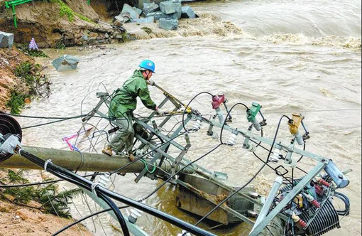 國網浙江江山市供電公司員工在峽口鎮東坑村扶正被洪水沖倒的電桿。
