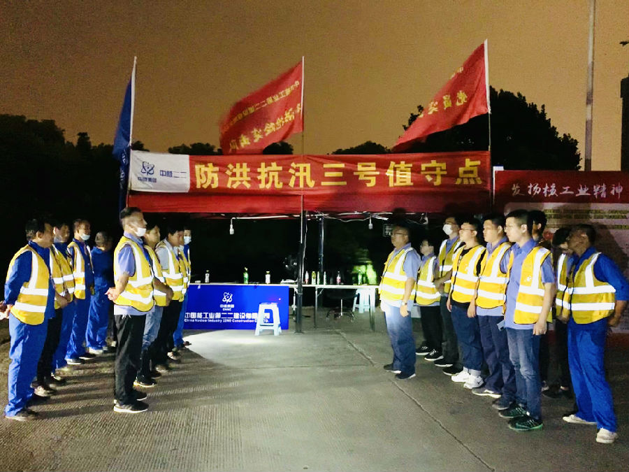 中(zhong)核(he)五公司值班人員夜(ye)間輪(lun)班巡(xun)堤,從堤面、堤身至堤腳(jiao)全面排查,對蓄(xu)水位高的(de)(de)(de)地段重點排查,認(ren)真記錄值班期間巡(xun)查情況,全力以(yi)赴守護社(she)區居民的(de)(de)(de)生命線。黑暗中(zhong),寫(xie)有“中(zhong)核(he)集(ji)團防汛突(tu)擊隊”字樣的(de)(de)(de)紅(hong)旗在燈光(guang)的(de)(de)(de)照耀下閃(shan)(shan)閃(shan)(shan)發(fa)光(guang)。