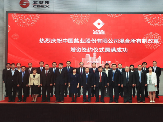 2019年9月19日,中鹽集團增資項目簽約儀式在北京產權交易所舉行。公司成功引入投資者13家,總投資額30.6億元。