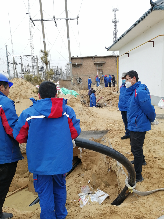 2月的(de)榆林寒風瑟(se)瑟(se),上午(wu)8時氣(qi)溫已至零(ling)下15攝氏(shi)度(du),隊(dui)(dui)(dui)員(yuan)們(men)(men)開始(shi)(shi)了緊張而有序(xu)地搶修(xiu)。由(you)于冷(leng)風犀利管(guan)(guan)(guan)(guan)道熱熔在(zai)野外,在(zai)穿(chuan)管(guan)(guan)(guan)(guan)過程中,PE管(guan)(guan)(guan)(guan)因過冷(leng)斷裂在(zai)管(guan)(guan)(guan)(guan)道內,第一次(ci)頂(ding)(ding)管(guan)(guan)(guan)(guan)失敗,但是(shi)隊(dui)(dui)(dui)員(yuan)們(men)(men)沒有氣(qi)餒(nei),經過商議(yi)后決定再(zai)(zai)次(ci)頂(ding)(ding)管(guan)(guan)(guan)(guan)并(bing)(bing)嘗試著(zhu)不加PE管(guan)(guan)(guan)(guan)。成(cheng)(cheng)功了,330米電(dian)纜線(xian)一次(ci)性穿(chuan)越(yue)成(cheng)(cheng)功。隊(dui)(dui)(dui)員(yuan)們(men)(men)再(zai)(zai)接再(zai)(zai)厲,繼(ji)續(xu)(xu)忙碌(liu)著(zhu)……頂(ding)(ding)管(guan)(guan)(guan)(guan)地頂(ding)(ding)管(guan)(guan)(guan)(guan),放線(xian)地放線(xian),施工現場一派熱火朝天的(de)景象,與這嚴(yan)寒形成(cheng)(cheng)了鮮明的(de)對比。為了節省時間(jian),指揮隊(dui)(dui)(dui)長要求食堂將打包好(hao)的(de)盒飯(fan)送到了工地,就這樣隊(dui)(dui)(dui)員(yuan)們(men)(men)把吃(chi)飯(fan)的(de)時間(jian)當作(zuo)“休息”。在(zai)經過11個小時的(de)連續(xu)(xu)作(zuo)戰后,440米長、7噸重的(de)電(dian)纜全(quan)部敷設到位。到了晚(wan)上寒風依然呼嘯著(zhu),可是(shi)隊(dui)(dui)(dui)員(yuan)們(men)(men)的(de)干勁(jing)確仍(reng)然沒有減(jian)退,為了保證施工質量(liang),他們(men)(men)開始(shi)(shi)了制作(zuo)電(dian)纜頭、耐壓試驗、架線(xian)、回填(tian)等作(zuo)業,終于在(zai)19日晚(wan)上9點成(cheng)(cheng)功實現并(bing)(bing)網(wang)。