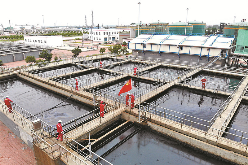 圖為冀東油田油氣集輸公司高尚堡聯合站黨支部,正組織黨員突擊隊頂烈日、冒酷暑在生化池邊開展收油活動。