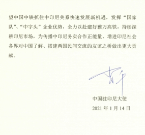 中國駐印尼大使肖千向活動發來賀信。他表示,中國中鐵雅萬高鐵項目部積極履行社會責任,重視本地人才培養,幫扶基層社區村鎮,協助地方政府抗疫、抗洪、抗震,贏得了項目沿線居民的好評和美譽。希望中國中鐵繼續發揮“國家隊”、“中字頭”企業優勢,全力以赴建好雅萬高鐵,深耕印尼市場,為傳播中印尼務實合作正能量、增進印尼社會各界對中國了解、搭建兩國民間交流的友誼之橋做出更大貢獻。