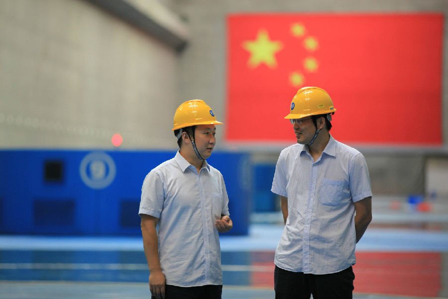 楊鵬(左)與同事在三峽電站左岸電廠內交流工作。 湯偉 攝