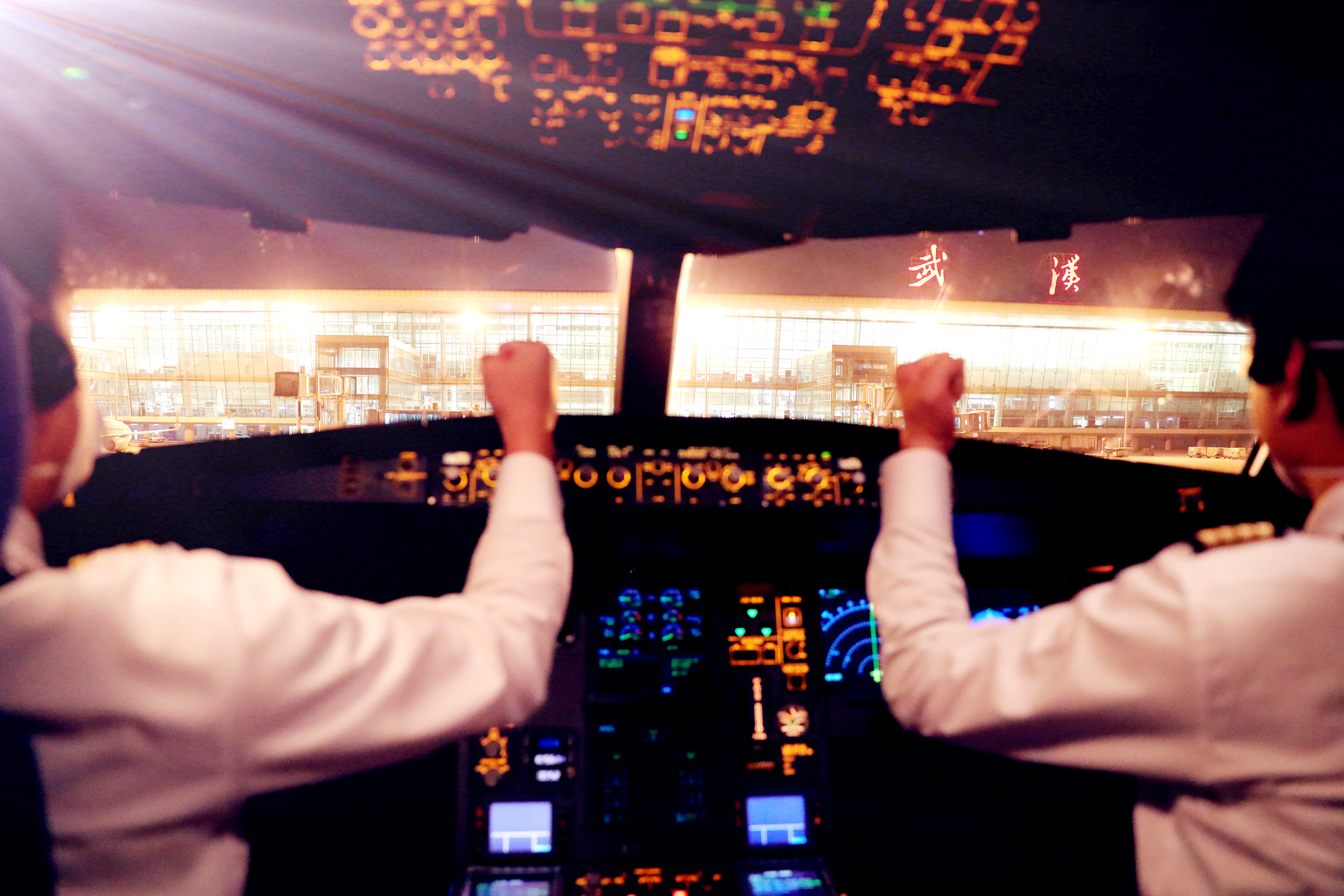 2020年2月13日,東航單日派出7架包機從4地運送援鄂醫療隊趕赴武漢抗疫一線。在武漢天河機場,東航上海飛行部飛行員握拳為武漢加油。
