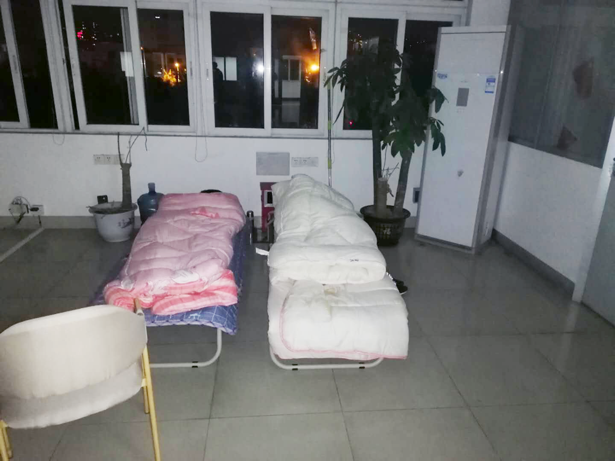 150余名干(gan)部職工(gong)和合作(zuo)方(fang)、客(ke)戶工(gong)作(zuo)人員(yuan)一起(qi),在臨時收拾(shi)出來的1000多平方(fang)米的機(ji)器人生(sheng)產廠房中(zhong)集結。80%員(yuan)工(gong)吃(chi)住在廠,24小時輪班作(zuo)戰。生(sheng)產車(che)間的頂燈(deng),從2月(yue)初打開,持續兩個多月(yue)沒有關閉……進入車(che)間就進入晝夜不(bu)分(fen)的戰斗狀態(tai)。環境(jing)陰冷、被褥簡陋,以車(che)為(wei)(wei)床、席(xi)地而(er)臥成為(wei)(wei)常態(tai)。