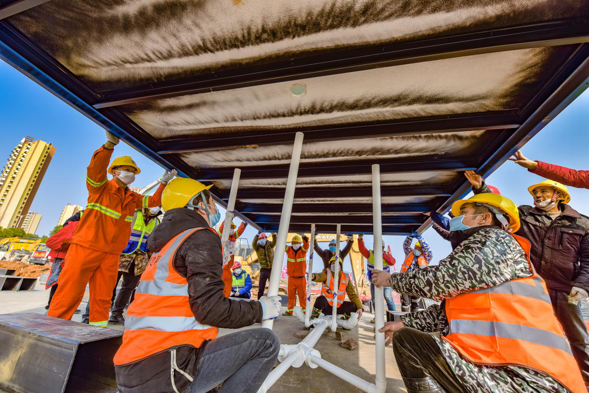 “兩山”醫(yi)院按照(zhao)傳染(ran)病(bing)醫(yi)院進(jin)行設計,環保要求高(gao)(gao)。功能區繁多且劃分(fen)嚴格(ge),為避(bi)免(mian)交叉感染(ran)需單獨(du)設置(zhi)新風(feng)系(xi)(xi)統(tong)。建筑布(bu)局(ju)復雜,對既有箱(xiang)式(shi)(shi)房(fang)改造量(liang)大。面(mian)對不利條件(jian),中建三局(ju)堅持以(yi)安全第一、質量(liang)至上、功能達標為前提,堅持高(gao)(gao)標準施(shi)工(gong)。一是采用裝(zhuang)配(pei)式(shi)(shi)建筑,像搭(da)積木一樣蓋房(fang)子,效率高(gao)(gao)、成本低、污(wu)染(ran)少。二是地基施(shi)工(gong)鋪設近20萬平方米HDPE防滲膜,防止污(wu)水(shui)和廢水(shui)下滲。集中收集、處理(li)污(wu)水(shui)和廢水(shui),經(jing)檢測合格(ge)再予以(yi)排放。生活垃圾和醫(yi)療(liao)廢棄(qi)物均配(pei)備收集設施(shi)。三是積極配(pei)合完成病(bing)房(fang)內(nei)的供氧系(xi)(xi)統(tong)、監測系(xi)(xi)統(tong)等醫(yi)療(liao)設備和系(xi)(xi)統(tong)的安裝(zhuang),確保交付即可使用。