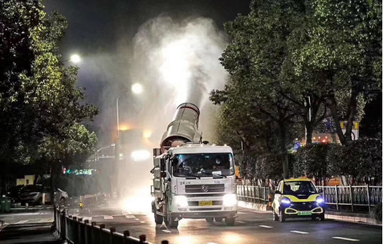 東風集團等駐鄂央企在自身疫情防控壓力巨大的情況下,第一時間積極投身戰疫一線。圖為東風消殺車。