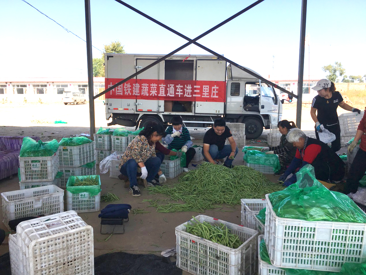 中國鐵建房地產集團堅持走產業扶貧道路,成立萬鐵商貿公司,廣開當地農副產品銷售渠道,使村民腰包不斷“鼓”起來。圖為蔬菜豐收時節,中國鐵建房地產集團職工幫助村民助銷蔬菜。