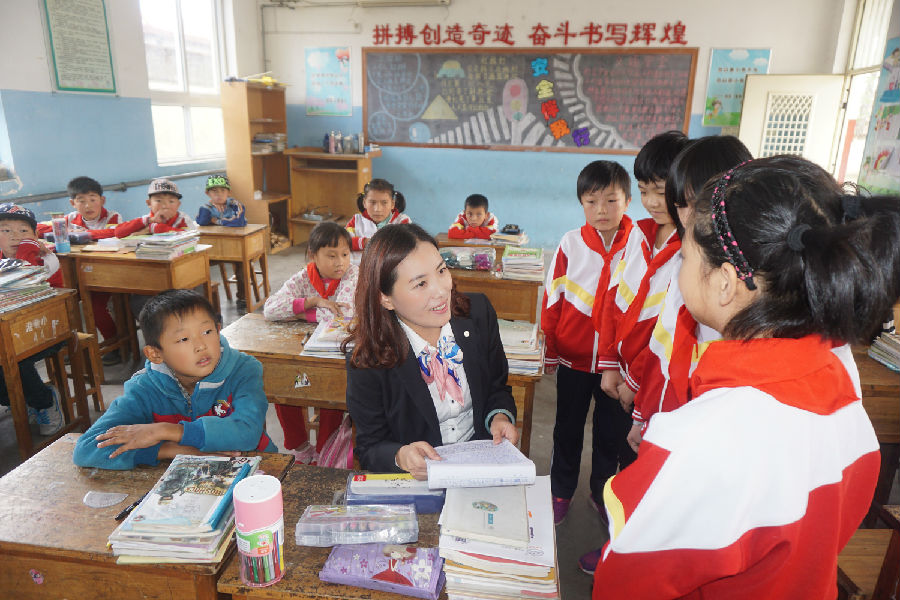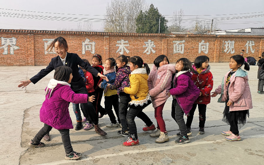 中檢集團志愿者在“金秋支教”扶貧活動中與魯山縣董周九小的學生們互動游戲。