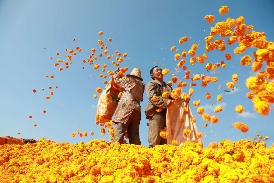 2019年10月,中國船舶集團有限公司定點扶貧縣云南省文山州丘北縣萬壽菊豐收場面。中國船舶集團通過產業扶貧基金扶持當地發展萬壽菊種植加工產業,帶動群眾脫貧致富。